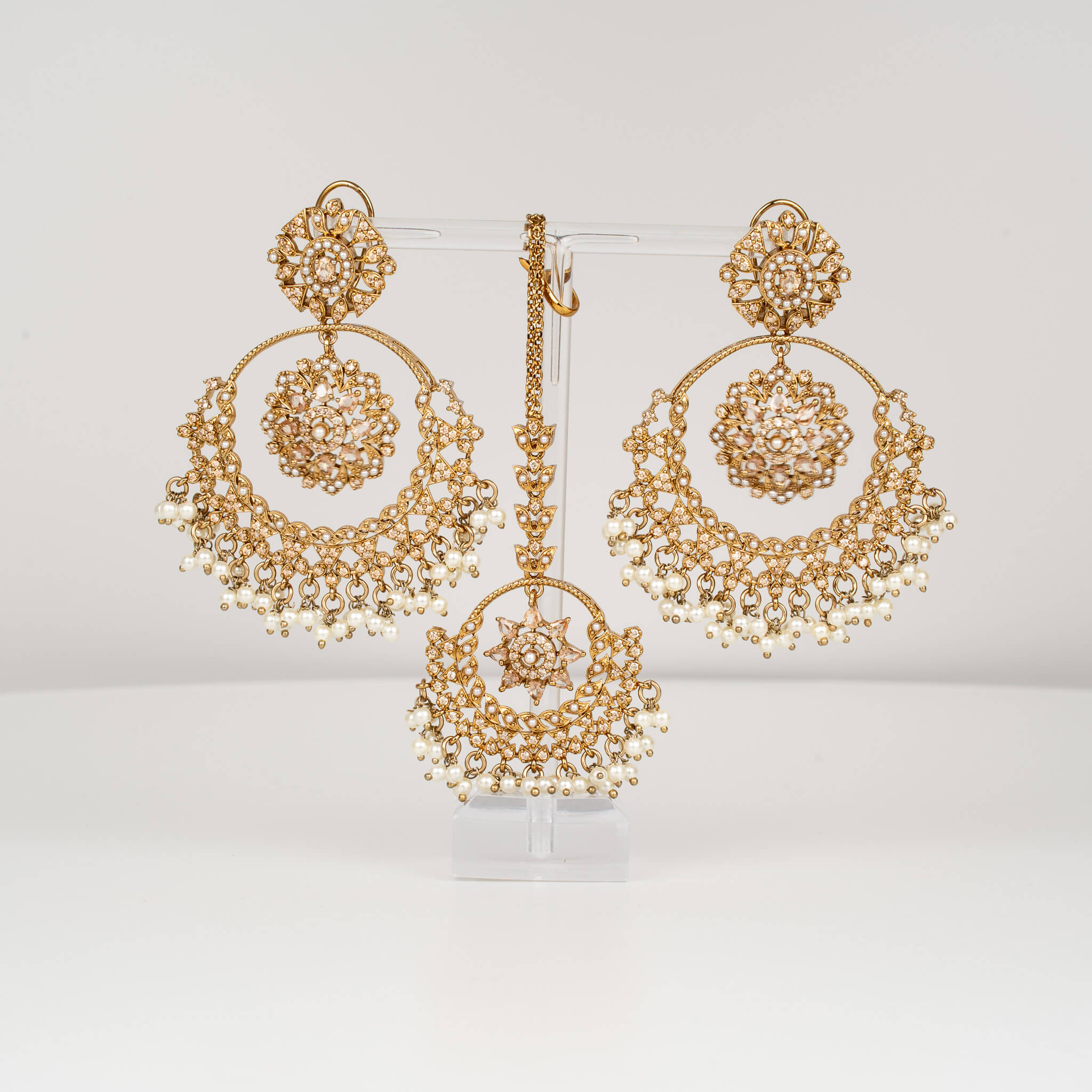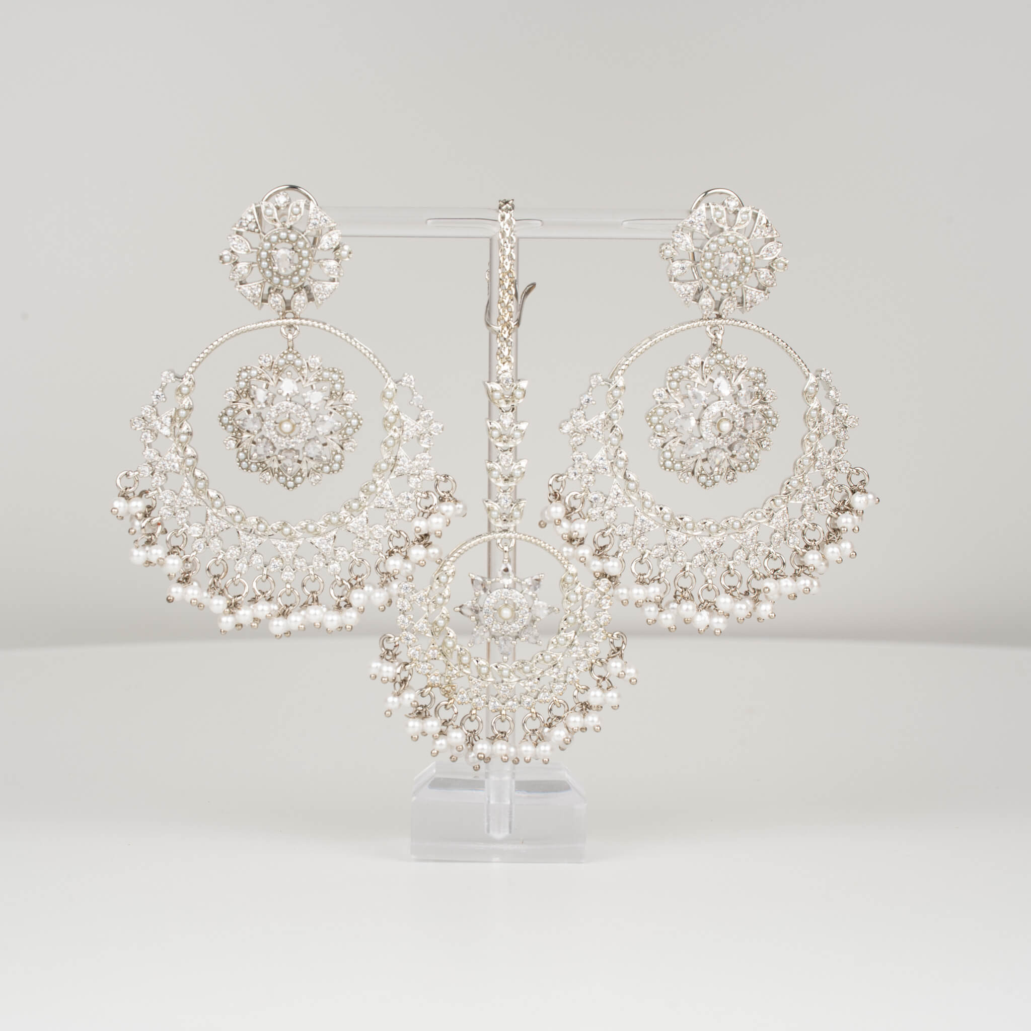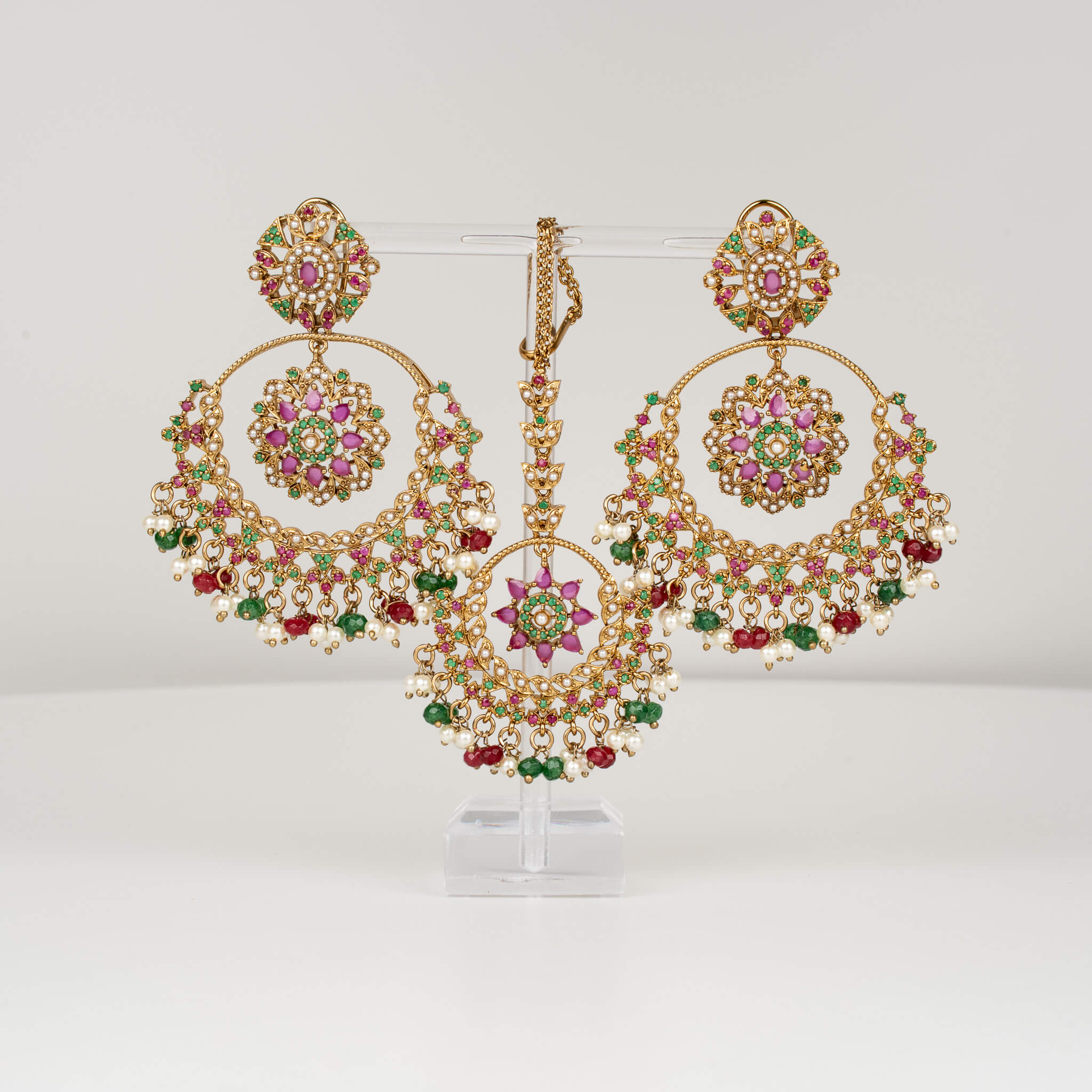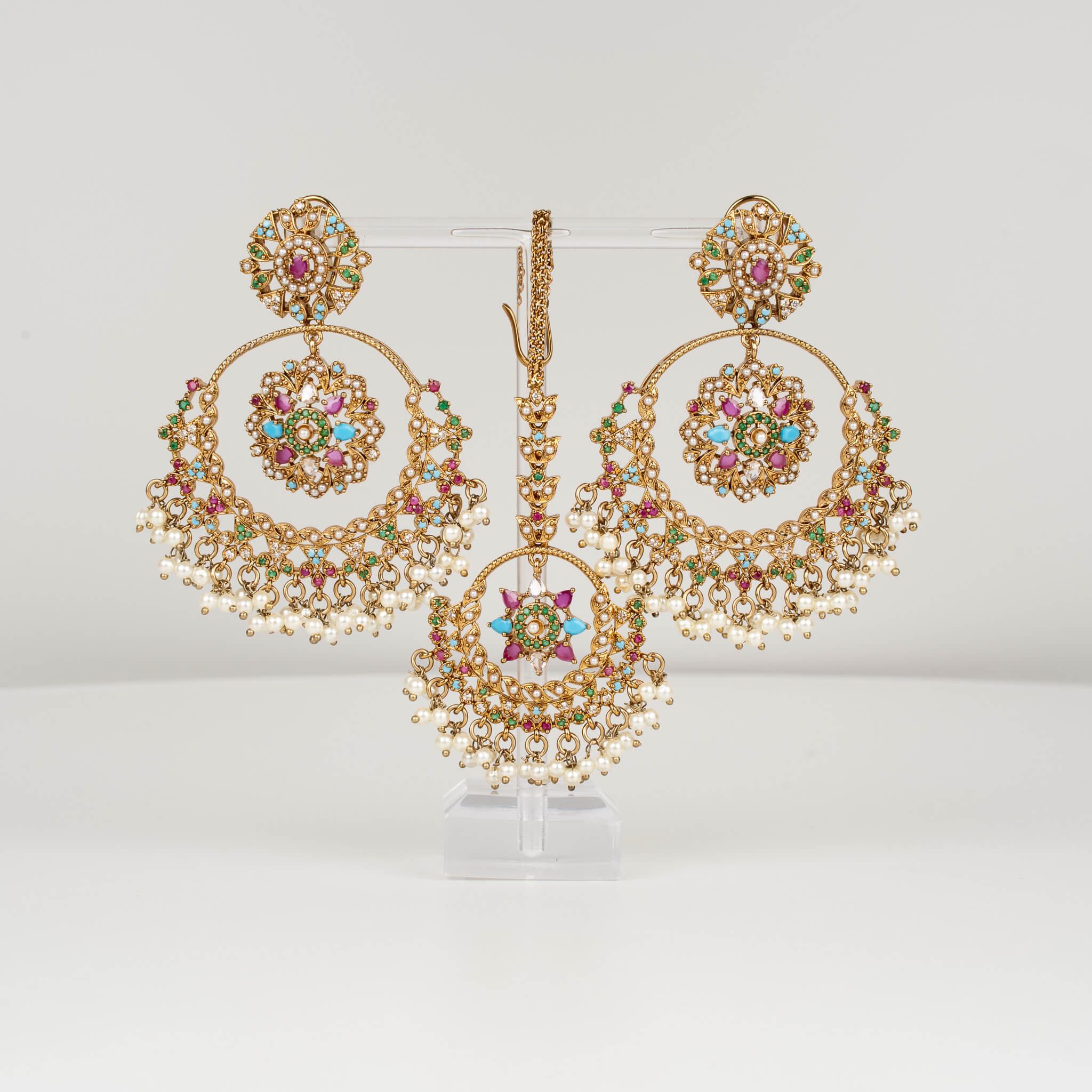 A stunning statement set featuring intricate stonework with vibrant colors accents, finished with delicate pearl drops. Designed to elevate any festive or bridal look with timeless elegance and rich detailing.
